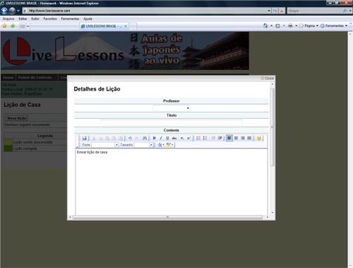 - marca e desmarca as aulas com antecedência; - escolhe os professores com quem deseja ter aula; - tem um histórico escolar que lhe mostra todas as aulas agendadas e assistidas; - recebe e-mails automáticos para te lembrar de quando uma aula foi agendada e muito mais. Tudo isso sem precisar sair de casa. Recursos: - Painel de Gerenciamento das aulas Nas aulas via Internet LIVE LESSONS além de todo o ambiente de uma sala de aula reproduzido virtualmente, você conta com recursos que vão muito além do esperado. Requisitos mínimos: - Conexão de Internet Banda Larga - Computador com microfone (webcam recomendado) ou Tablets (veja instruções) - Fone de ouvido (recomendado)